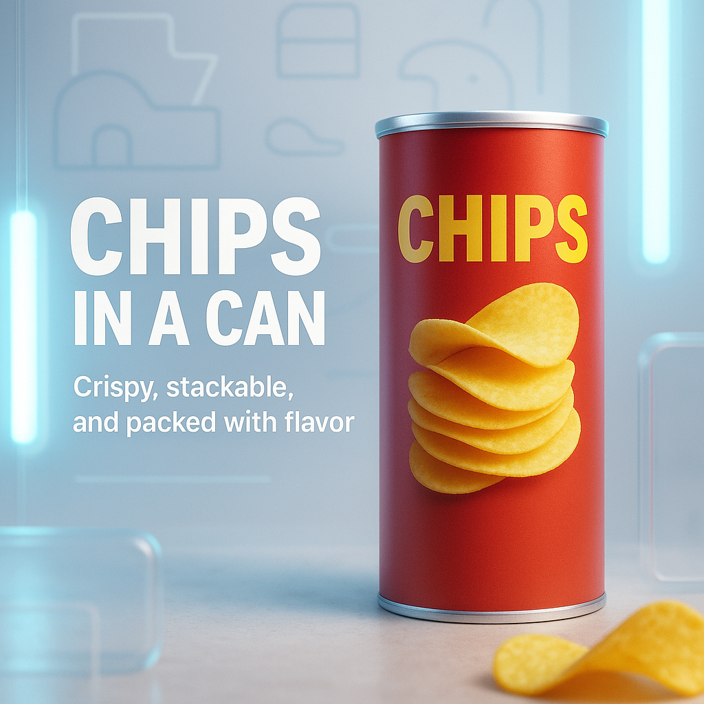 A visually appealing packaging mockup featuring a can of stackable chips, designed with vibrant colors and modern aesthetics, ideal for snack branding and marketing.