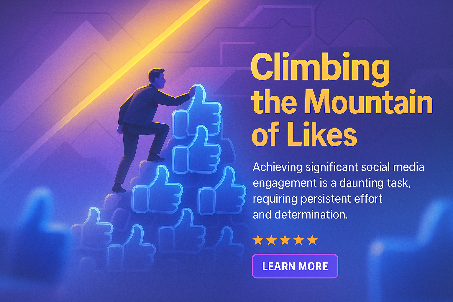 /Collection: /by davooda/Type: PNG/A digital illustration depicting a figure climbing a mountain of thumbs-up icons, symbolizing the challenge of achieving social media engagement. The vibrant colors and modern design target social media marketers.