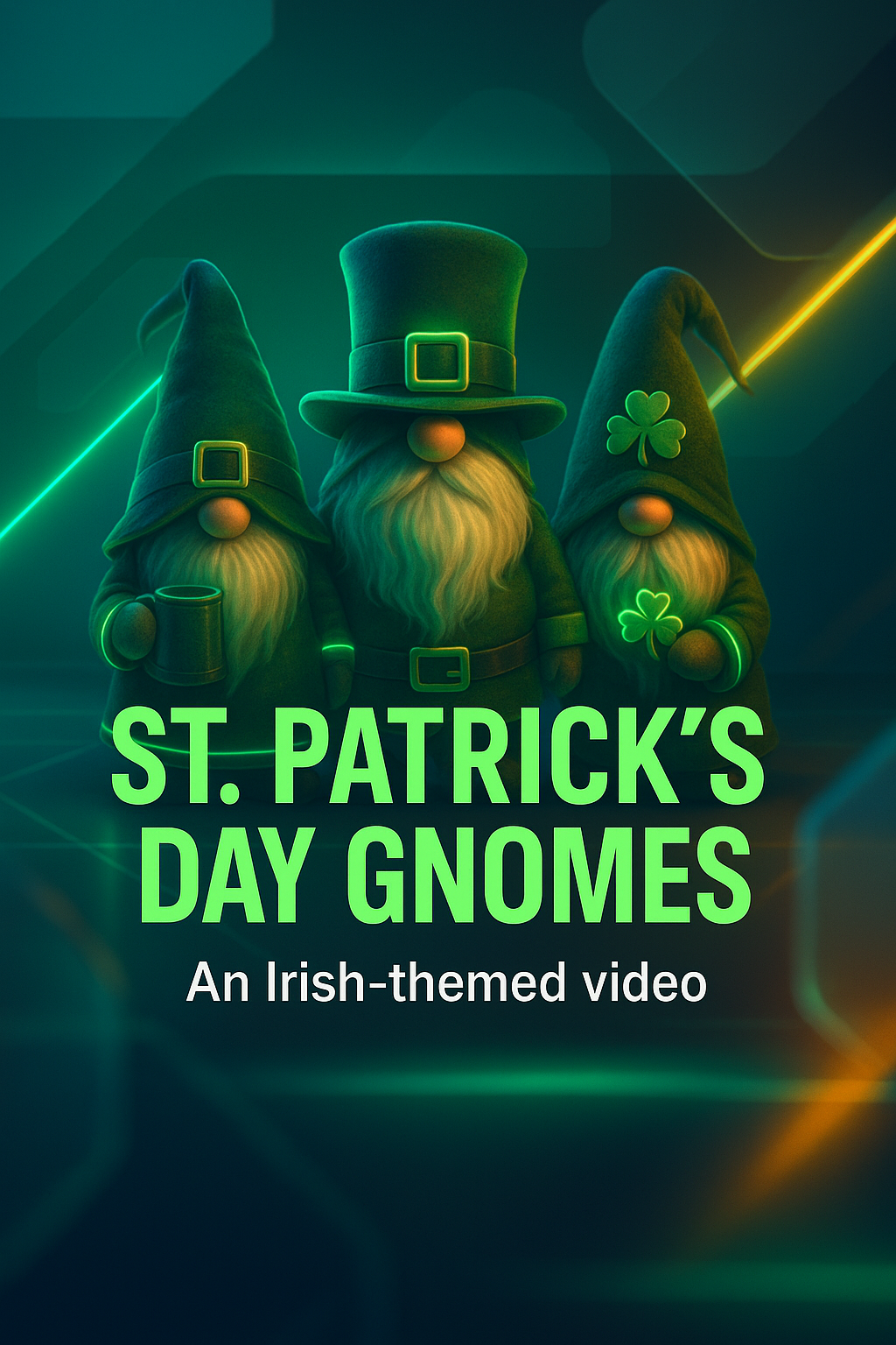 Colorful digital illustration featuring whimsical gnomes in celebratory attire for St. Patrick's Day. Ideal for festive video content or holiday promotions.