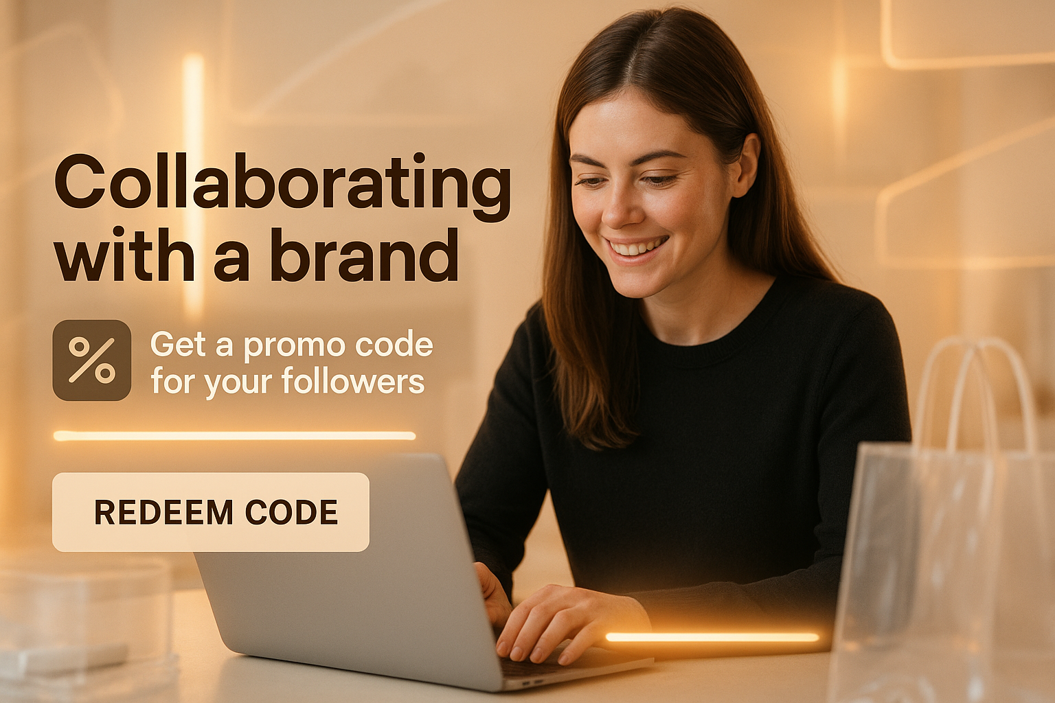/Collection: /by davooda/Type: PNG/Engaging social media post showcasing a woman working on a laptop, promoting a collaboration with a brand. The warm color palette and modern design elements enhance its appeal for influencer marketing.