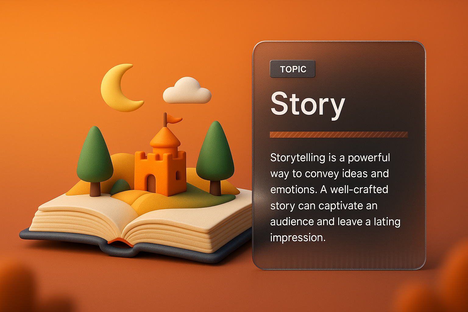 A vibrant 3D illustration showcasing a castle, trees, and clouds on an open book. The design includes a transparent label that integrates seamlessly with the visuals, emphasizing storytelling.