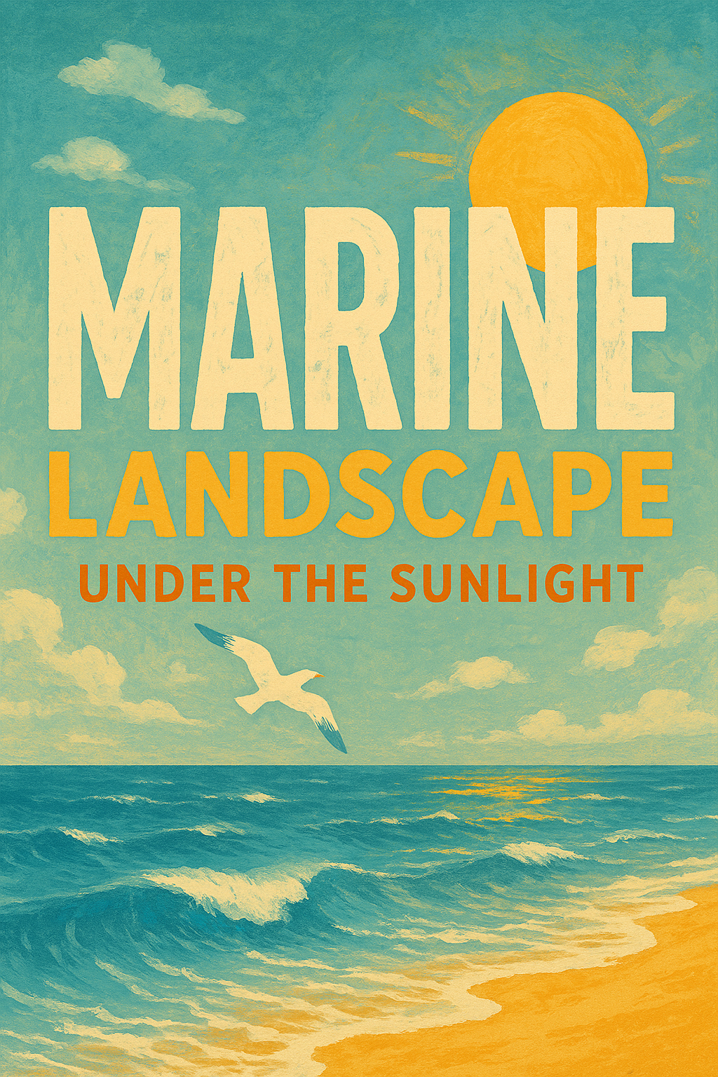 Vibrant illustration depicting a marine landscape under sunlight, featuring bold typography. Ideal for coastal-themed decor or promotional materials.