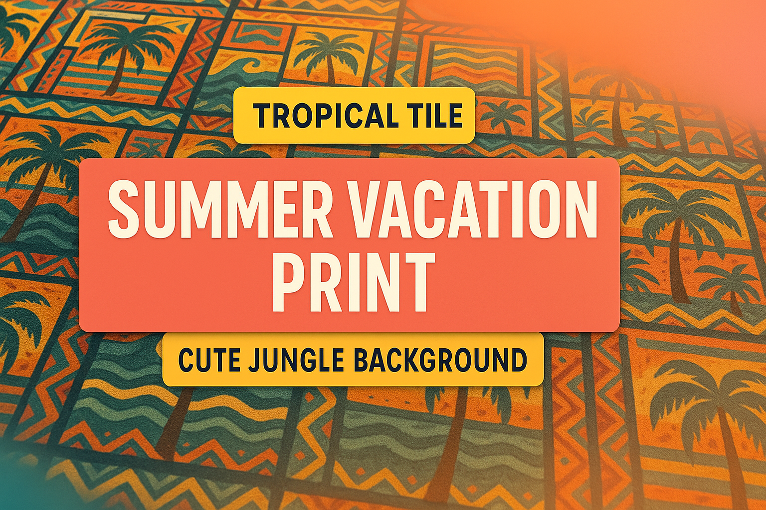 Colorful summer vacation print featuring a tropical tile design with jungle elements, ideal for travel-themed projects and seasonal promotions.