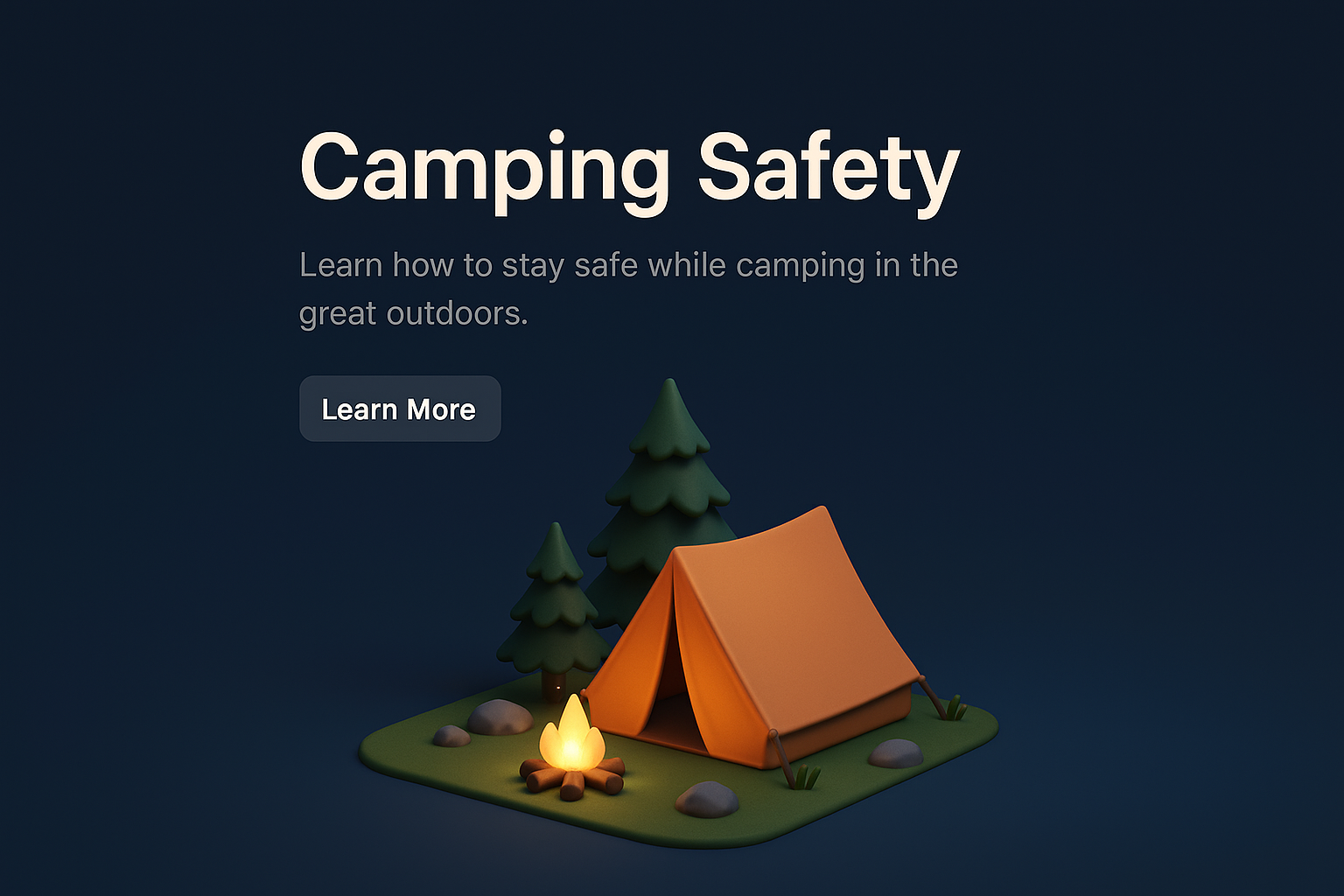 A 3D scene showcasing a camping setup featuring a tent, campfire, and trees against a dark gradient background. The design emphasizes safety in the outdoors.