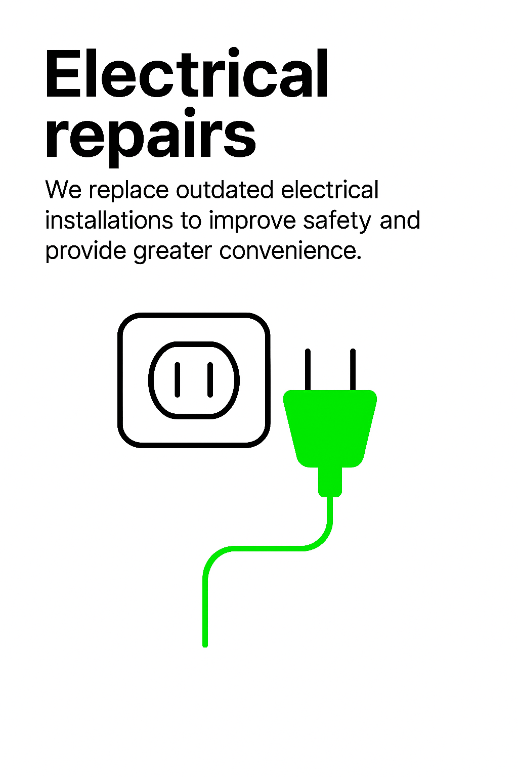 Simple and modern graphic promoting electrical repair services, featuring a plug and socket illustration with bold typography. Ideal for service advertisements.