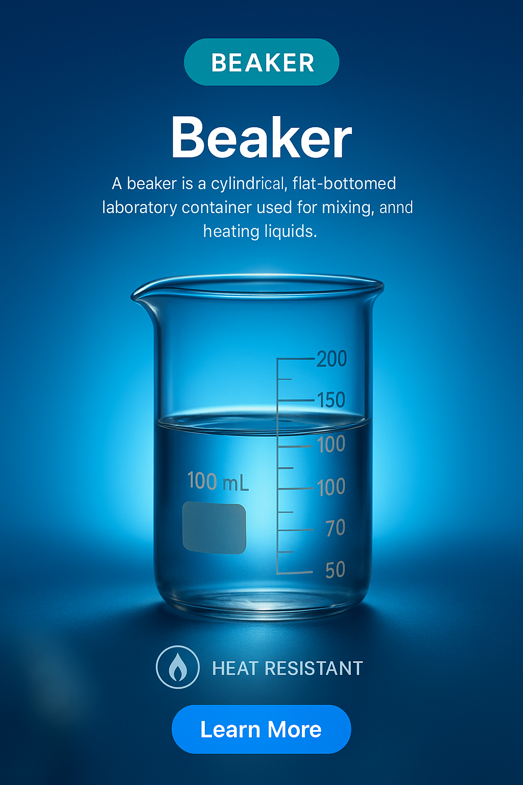 This image features a transparent laboratory beaker filled with liquid, showcasing its measurement markings. It is designed for educational or promotional purposes related to science.