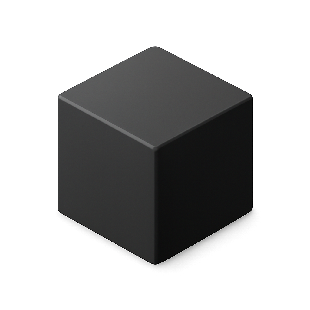 A sleek, minimalist 3D black box icon rendered in a three-quarter view, featuring smooth edges and a volumetric appearance against a transparent background.