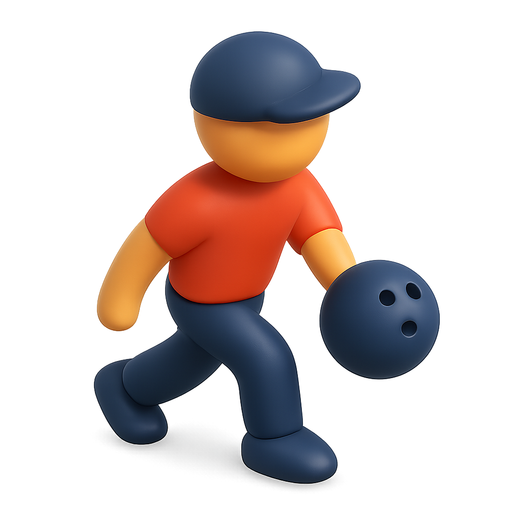 A vibrant 3D icon of a bowler in a three-quarter view, wearing a cap and holding a bowling ball, featuring a smooth, volumetric design against a subtle gradient background.