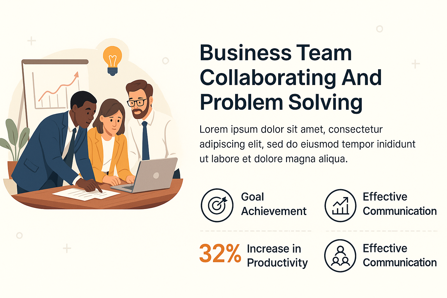 /Collection: /by davooda/Type: PNG/Illustrative graphic depicting a business team collaborating around a laptop, focusing on problem-solving and productivity metrics. Ideal for corporate communication and team-building content.