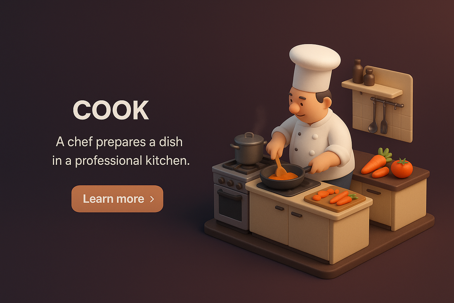 A realistic 3D scene depicting a chef cooking in a professional kitchen. The background is dark with a smooth gradient, highlighting the chef and kitchen elements.