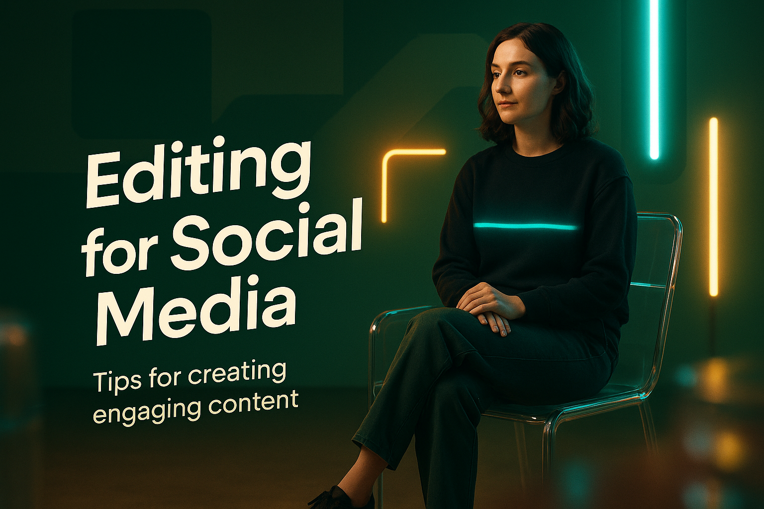 A modern social media post featuring a woman seated against a stylish background with neon lights. Ideal for promoting tips on engaging content creation.