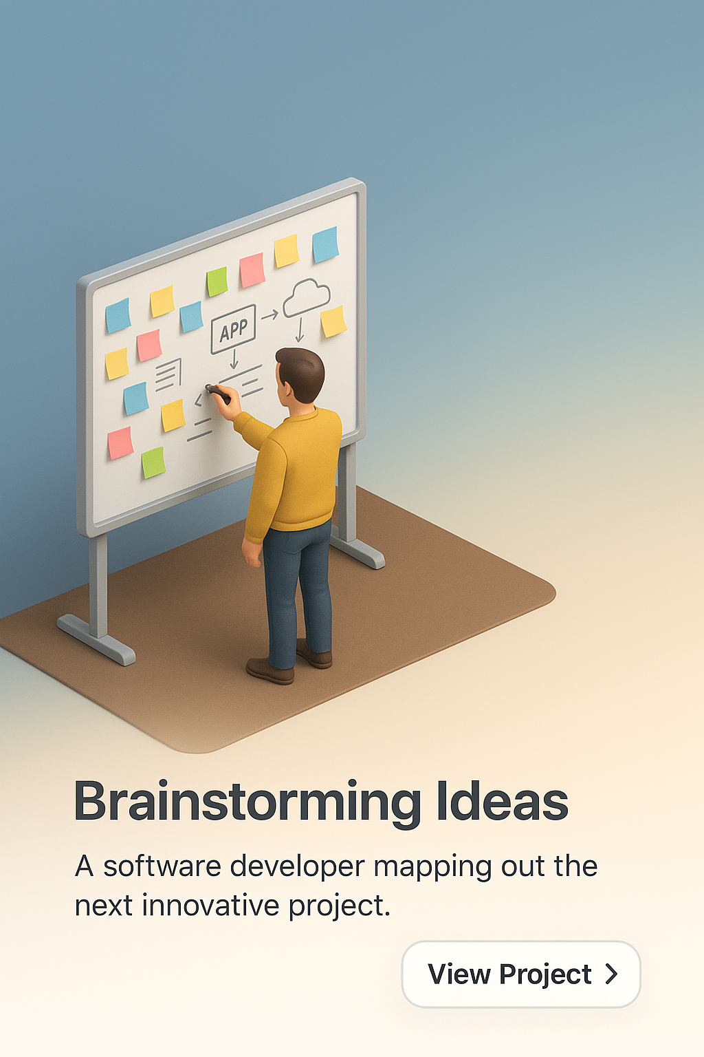 A software developer stands next to a whiteboard filled with colorful sticky notes and diagrams, strategizing the next innovative project in a 3D scene.