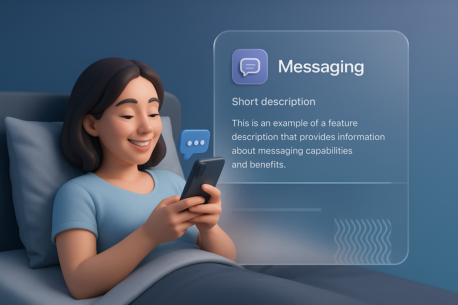 A woman lies comfortably on her bed, smiling as she reads a message on her phone. The background features a smooth gradient, enhancing the cozy atmosphere.