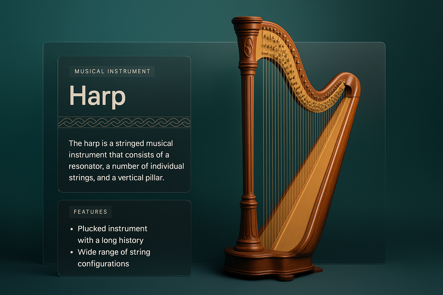 /Collection: /by davooda/Type: PNG/A detailed 3D rendering of a harp, showcasing its elegant structure. The image features integrated design elements, including informative text blocks and a gradient background for depth.