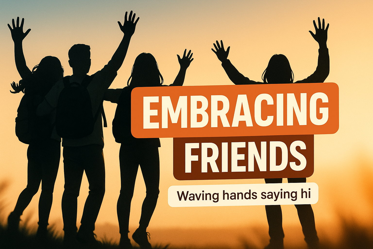 A vibrant social media post featuring silhouetted friends waving against a sunset backdrop, conveying warmth and connection. Ideal for friendship or community-themed content.