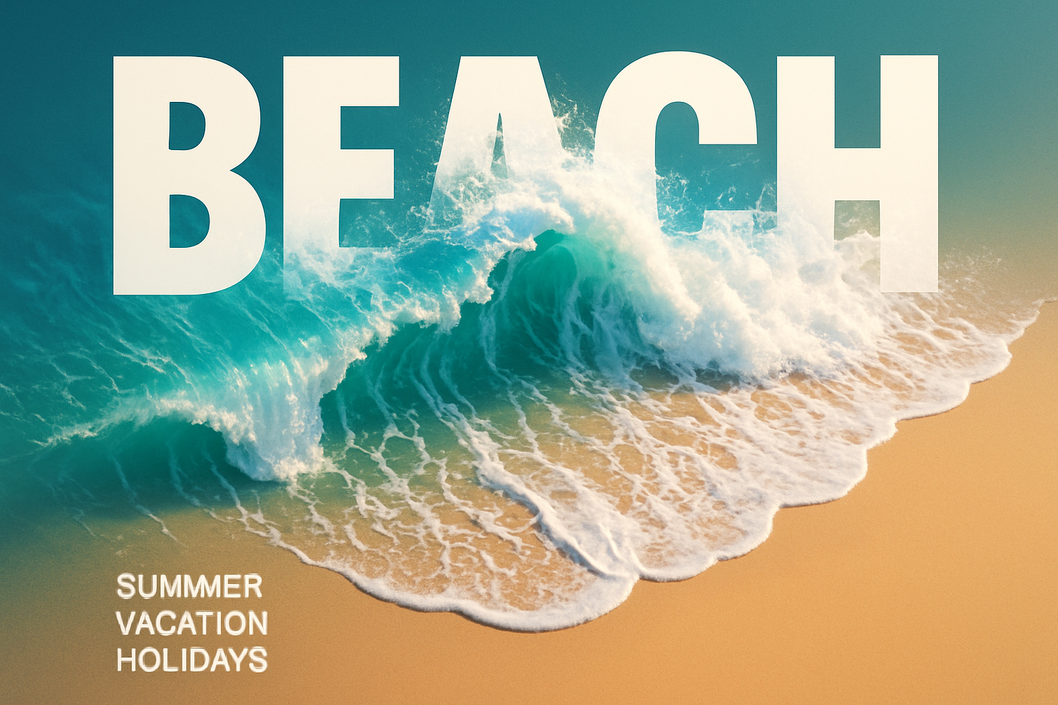 An aerial view of ocean waves crashing onto a sandy beach, featuring a large, bold 'BEACH' text overlay. The image captures the essence of summer vacations with a striking, modern aesthetic.