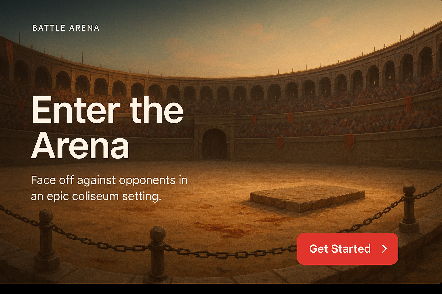 A stylish web page layout featuring a battle arena theme, complete with a gradient background, engaging text, and a prominent action button.