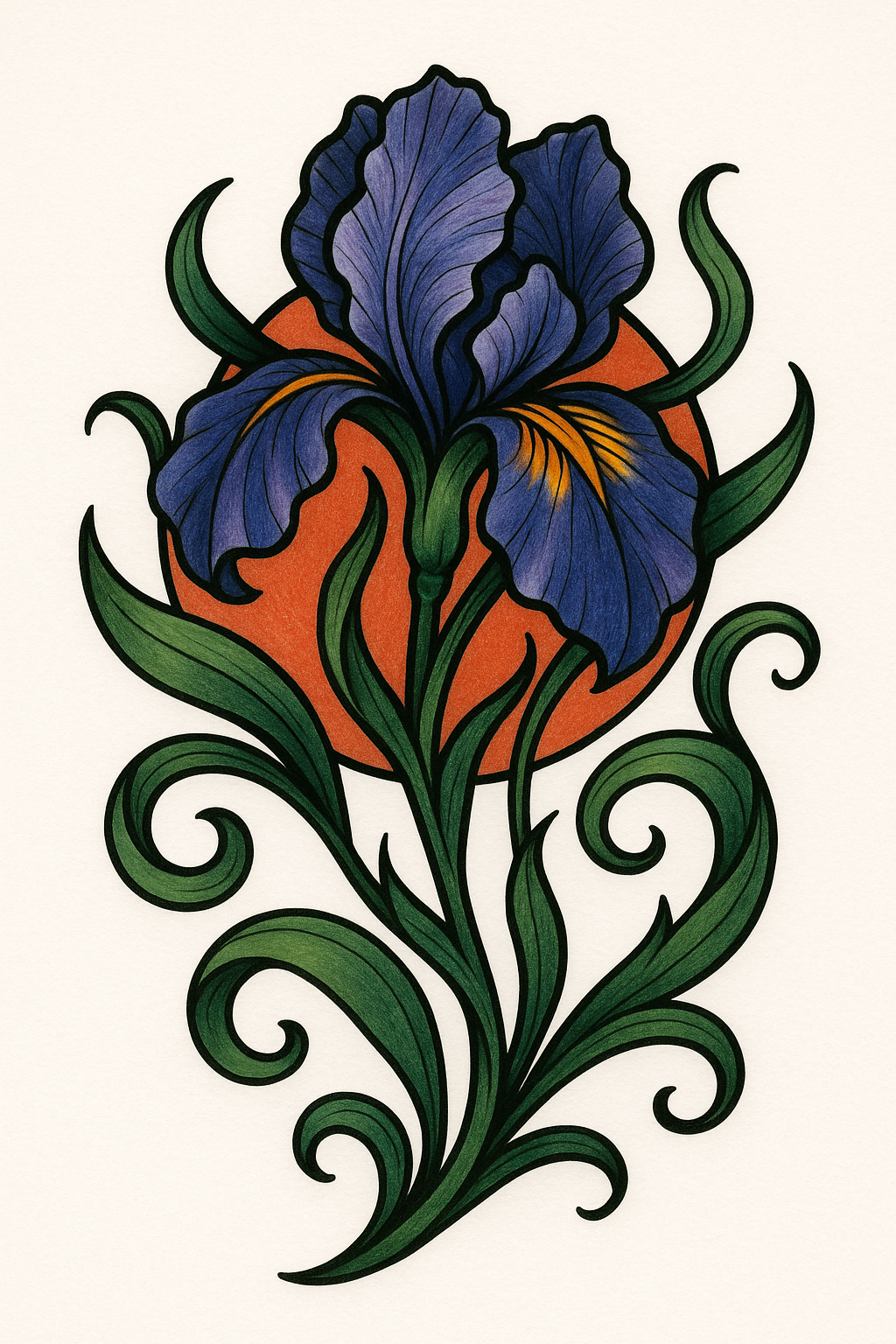 Vibrant Floral Illustration with Iris and Decorative Elements
