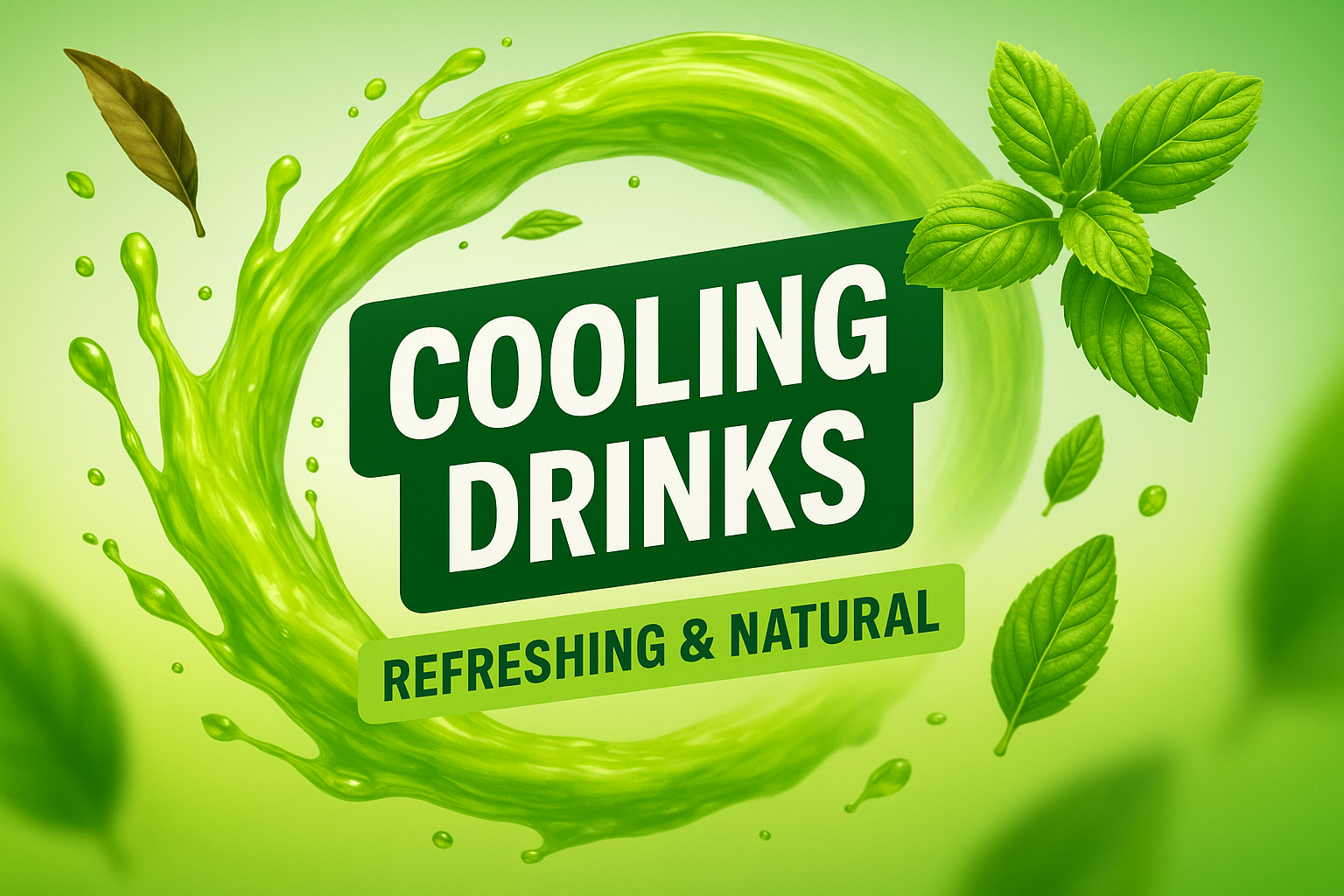Colorful promotional graphic for cooling drinks featuring a refreshing green theme with mint leaves, ideal for beverage marketing and advertising.