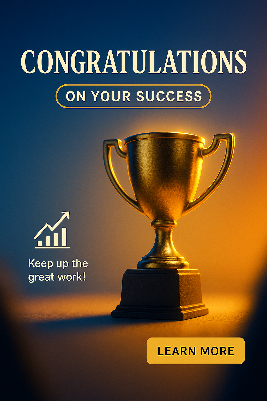 This is a motivational social media post featuring a trophy symbolizing achievement and success. The design employs warm colors and a sleek layout, ideal for congratulatory messages.