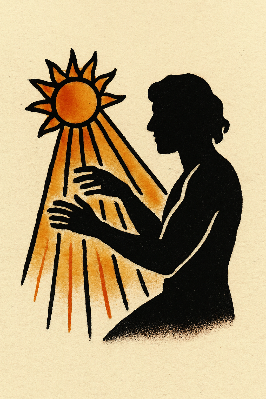 A striking silhouette of a person reaching towards a sun, depicted as a harp made of rays. The artwork features warm colors against a light beige background.
