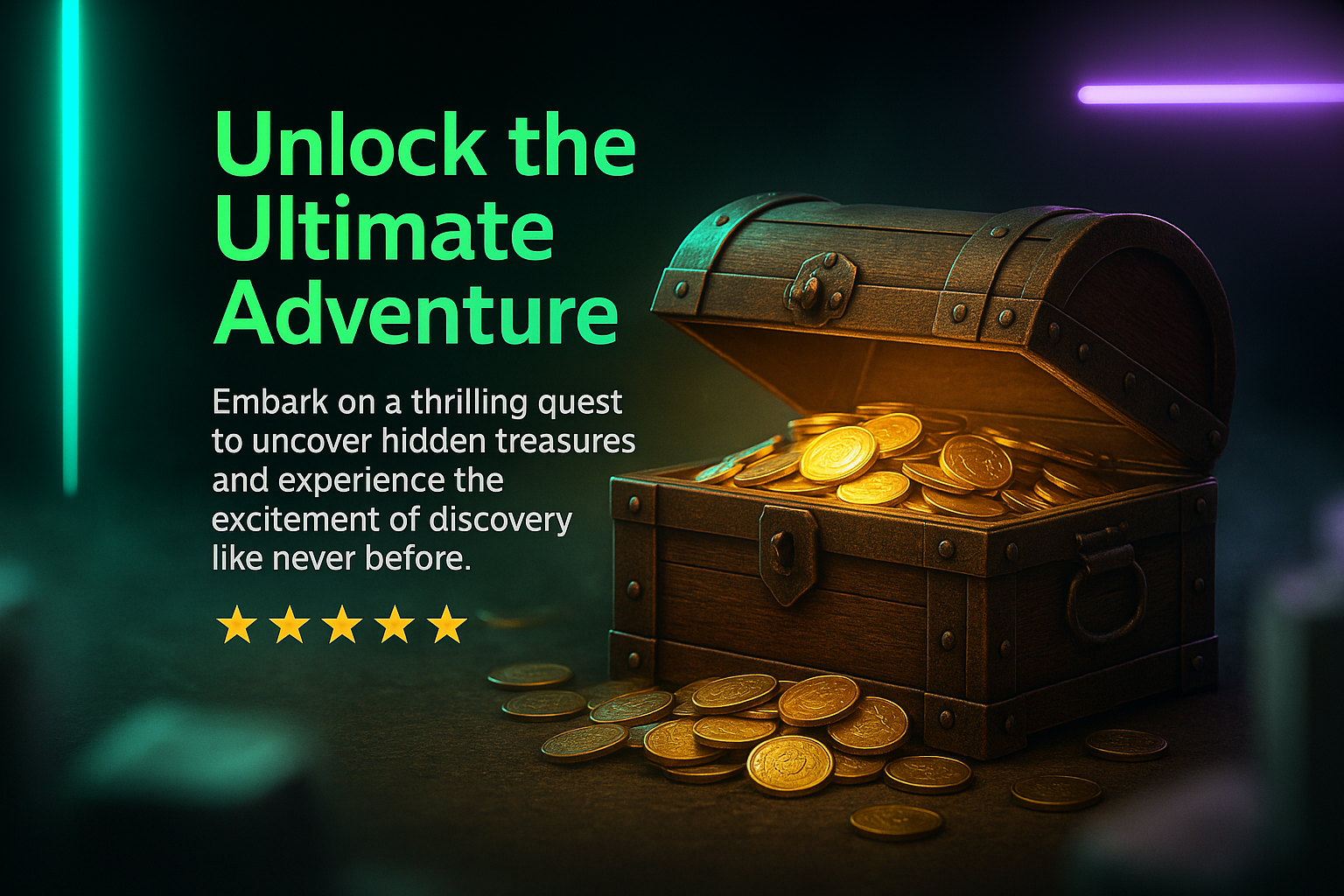 /Collection: /by davooda/Type: PNG/A visually striking carousel slide featuring a treasure chest overflowing with gold coins, illuminated by neon accents. Bold text invites viewers to embark on an adventure, blending realism with engaging design elements.