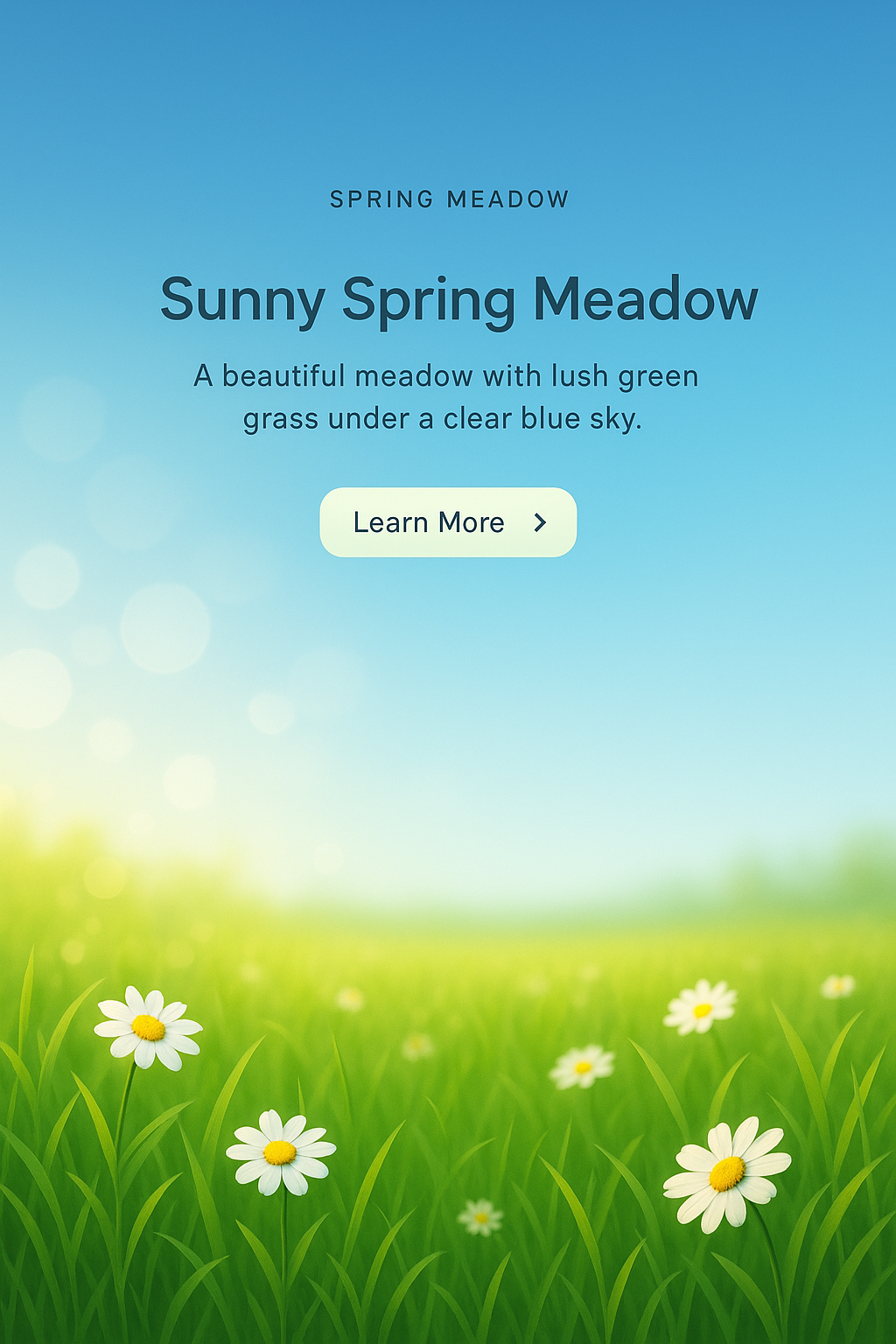 /Collection: /by davooda/Type: PNG/A vibrant illustration of a sunny spring meadow, featuring lush green grass and a clear blue sky. The design includes small text elements and a call-to-action button, creating a cohesive visual.