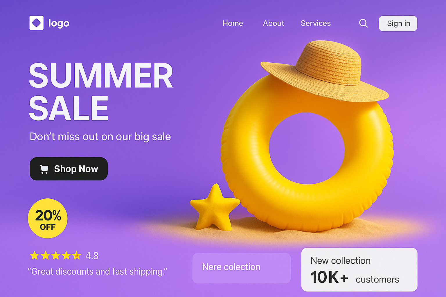 /Collection: /by davooda/Type: PNG/A vibrant landing page design featuring a yellow inflatable ring and star against a purple background. Includes promotional text, action buttons, and a clean layout.