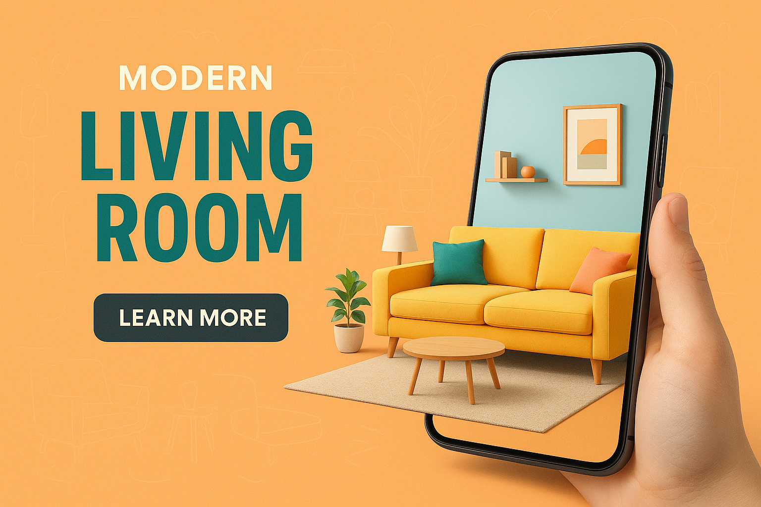 /Collection: /by davooda/Type: PNG/A vibrant modern living room scene emerges from a smartphone, showcasing a stylish yellow sofa and decor. The layout features bold typography and a balanced composition.