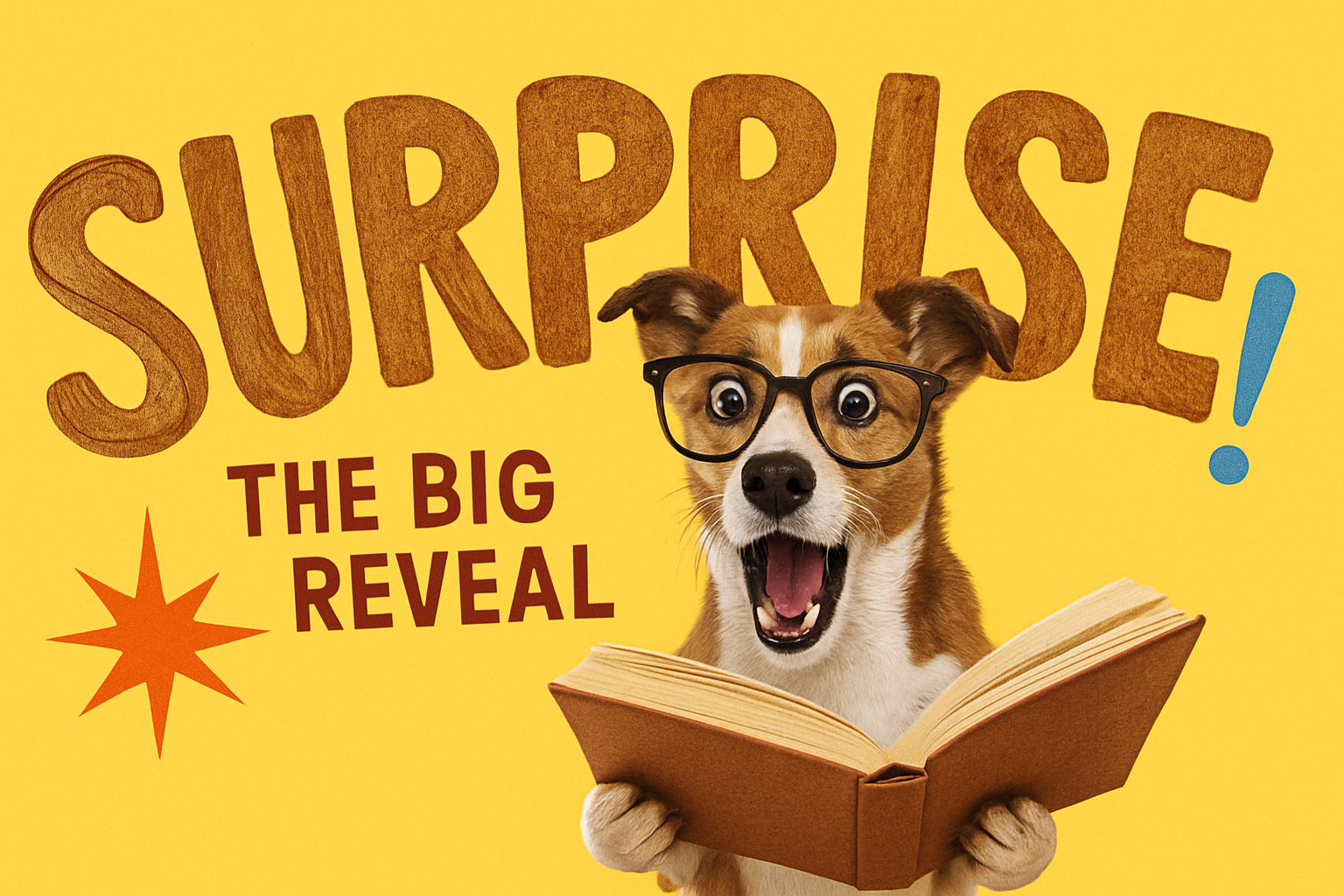 /Collection: /by davooda/Type: PNG/A whimsical graphic featuring a surprised dog wearing glasses, holding an open book against a bright yellow background. Ideal for social media or promotional content.