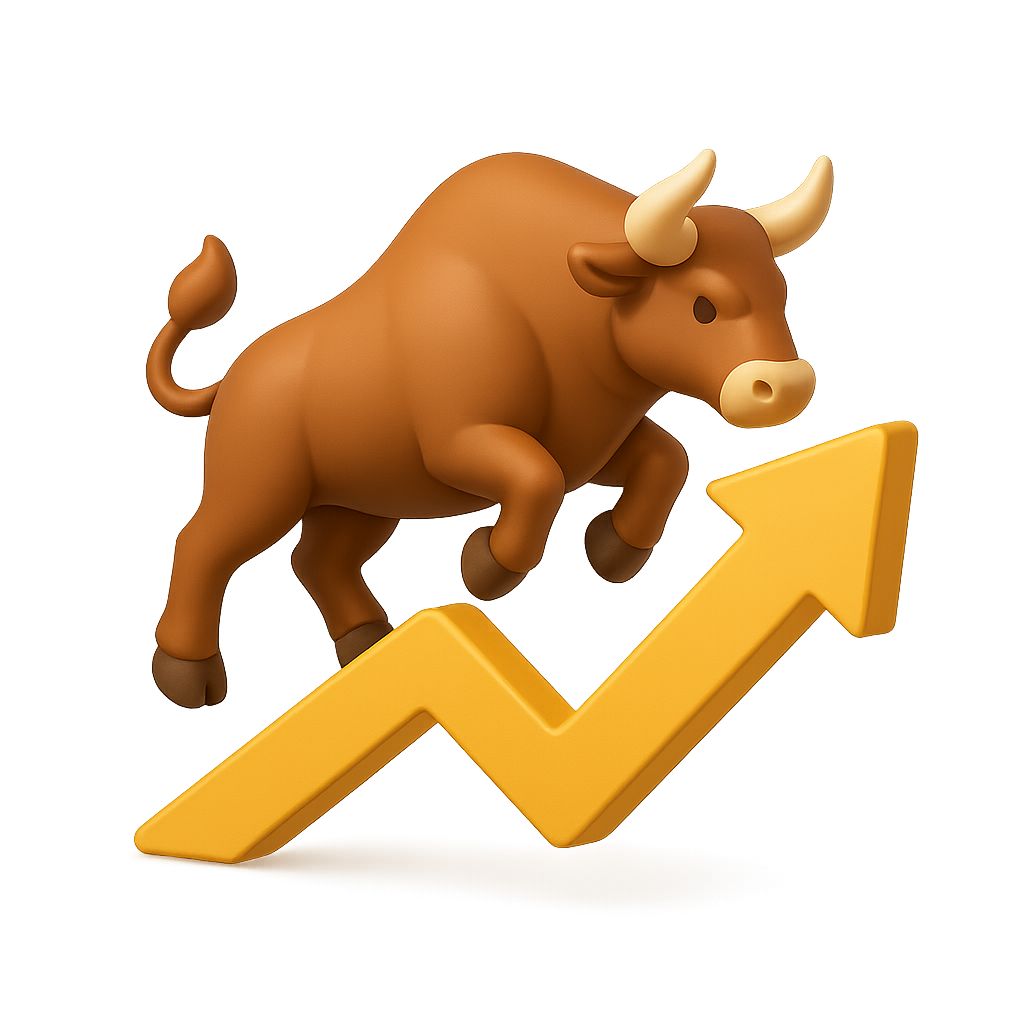A stylized 3D bull leaping over a golden upward trend arrow, symbolizing market growth and bullish sentiment. The design features a soft gradient background.