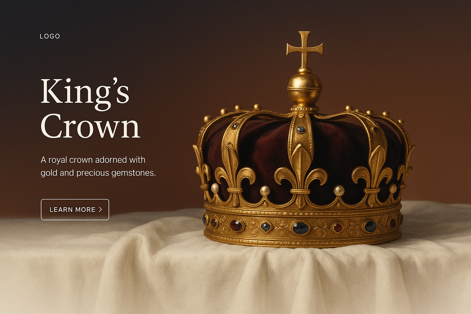 /Collection: /by davooda/Type: PNG/An elegant king's crown adorned with gold and precious gemstones, set against a gradient background. The design features a prominent logo and a call-to-action button.
