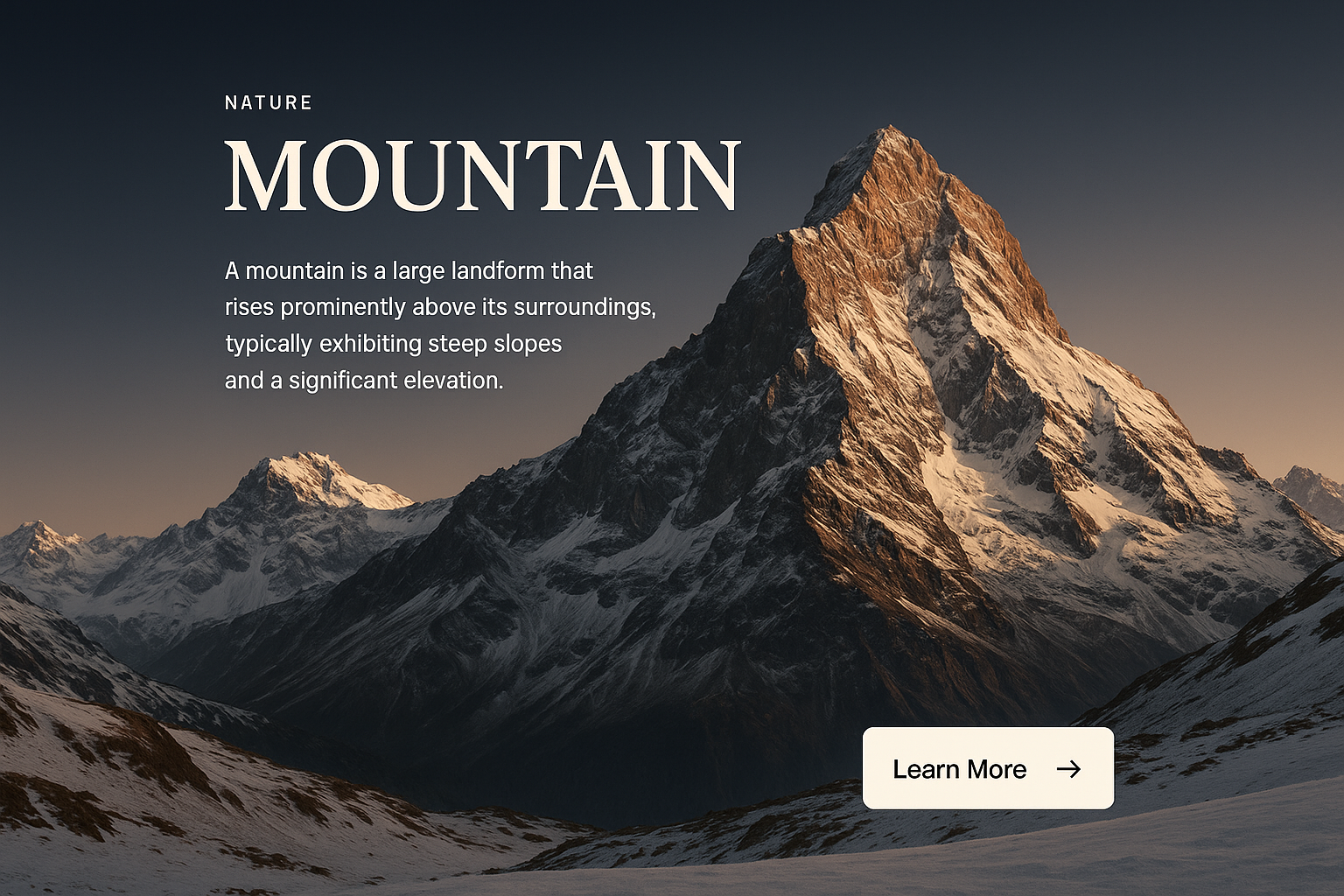 A captivating mountain scene featuring a grand peak with steep slopes and a snow-covered foreground. The serene gradient background enhances the visual appeal, complemented by elegant text overlay.