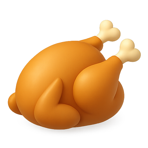 A playful 3D illustration of a roast chicken, featuring a cute and rounded design. Ideal for food-related digital content or branding.