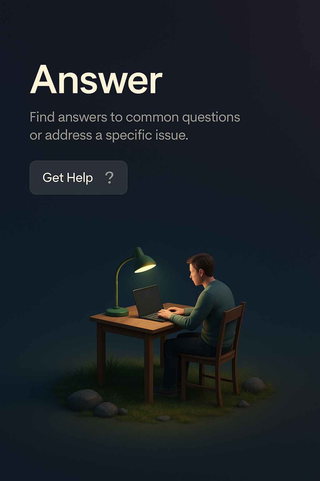/Collection: /by davooda/Type: PNG/A zoomed-out view of a man sitting at a desk with a laptop, illuminated by a desk lamp. The scene features a dark gradient background with rocks and grass around the table, creating a calm, focused atmosphere.