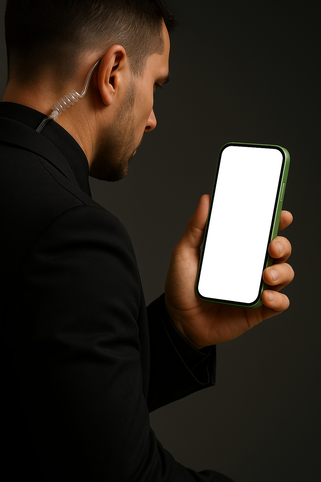 Security Guard Holding Green Phone Vigilantly in Stylish Setting