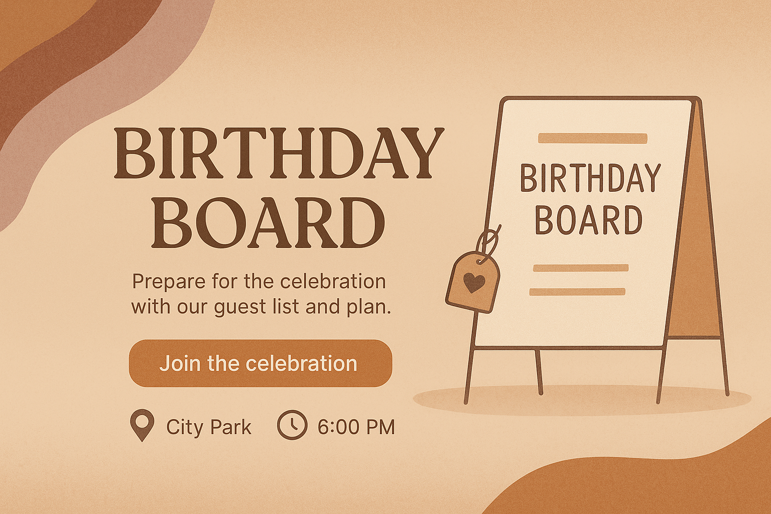 A boho-style landing page featuring a birthday board with a guest list and celebration plan. The design includes a warm color palette with layered elements for visual appeal.