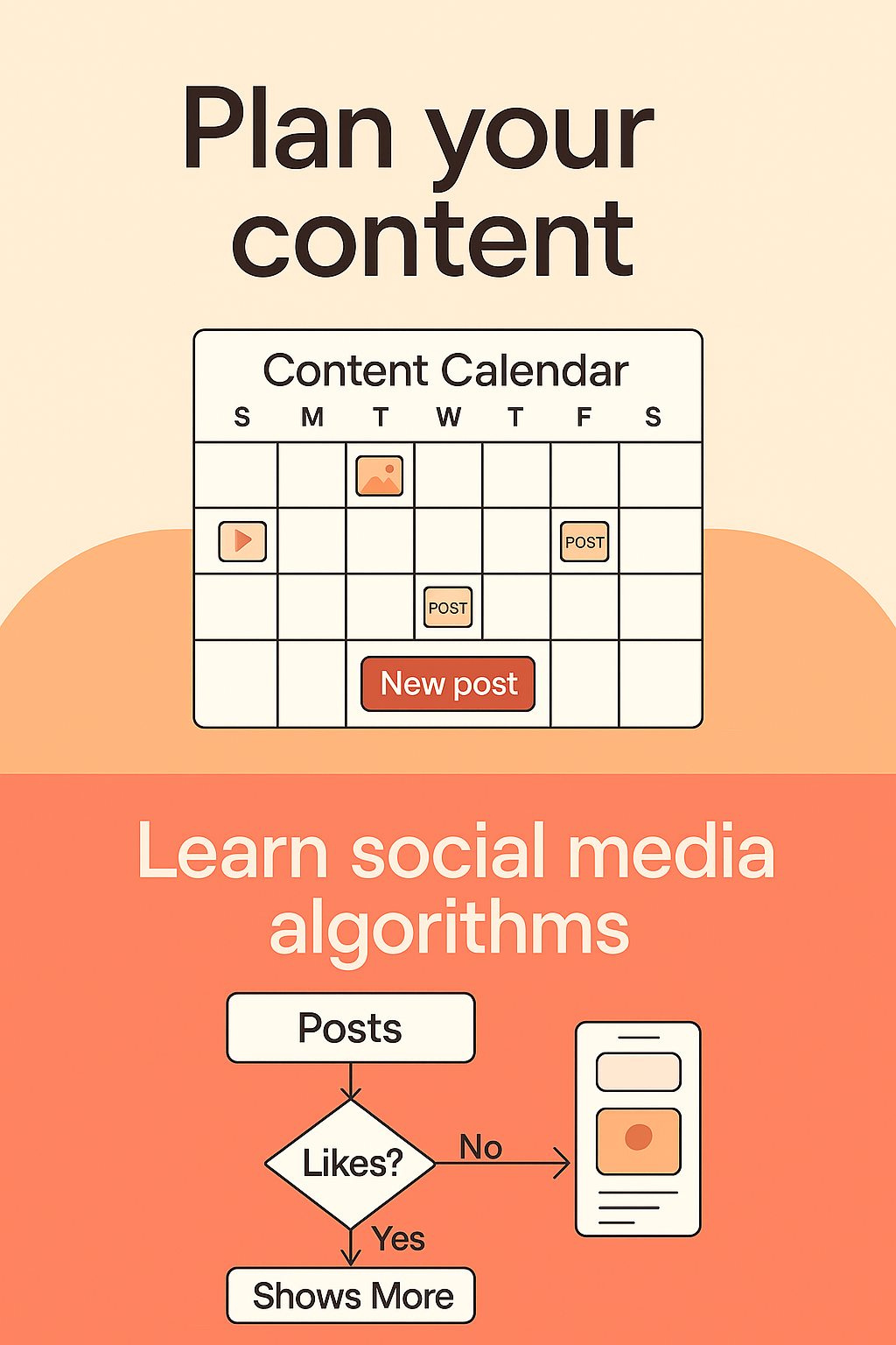 /Collection: /by davooda/Type: PNG/Informative infographic designed for social media management, featuring a content calendar and flowchart for understanding algorithms, ideal for marketers and content creators.