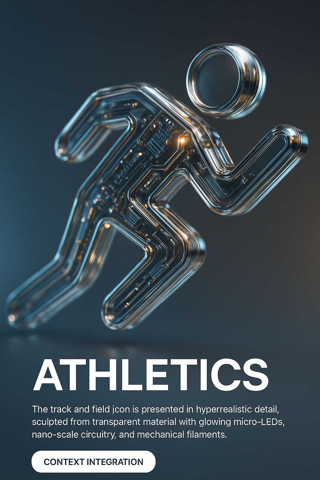 /Collection: /by davooda/Type: PNG/A hyperrealistic athletics icon crafted from clear materials, showcasing intricate micro-LEDs and mechanical filaments. The design reflects ambient light with metallic sheen, set against a gradient background.