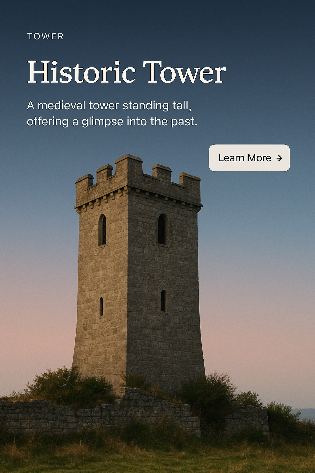 A tall medieval tower stands against a soft gradient sky, with a clean layout including a title, descriptive text, and a prominent action button.