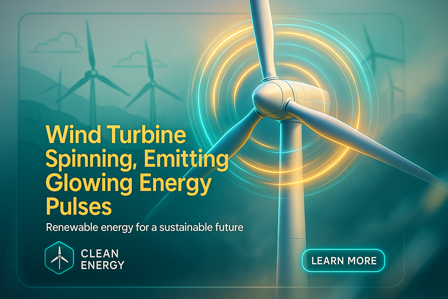 /Collection: /by davooda/Type: PNG/Vibrant digital illustration showcasing a spinning wind turbine emitting glowing energy pulses, promoting renewable energy concepts aimed at sustainability.
