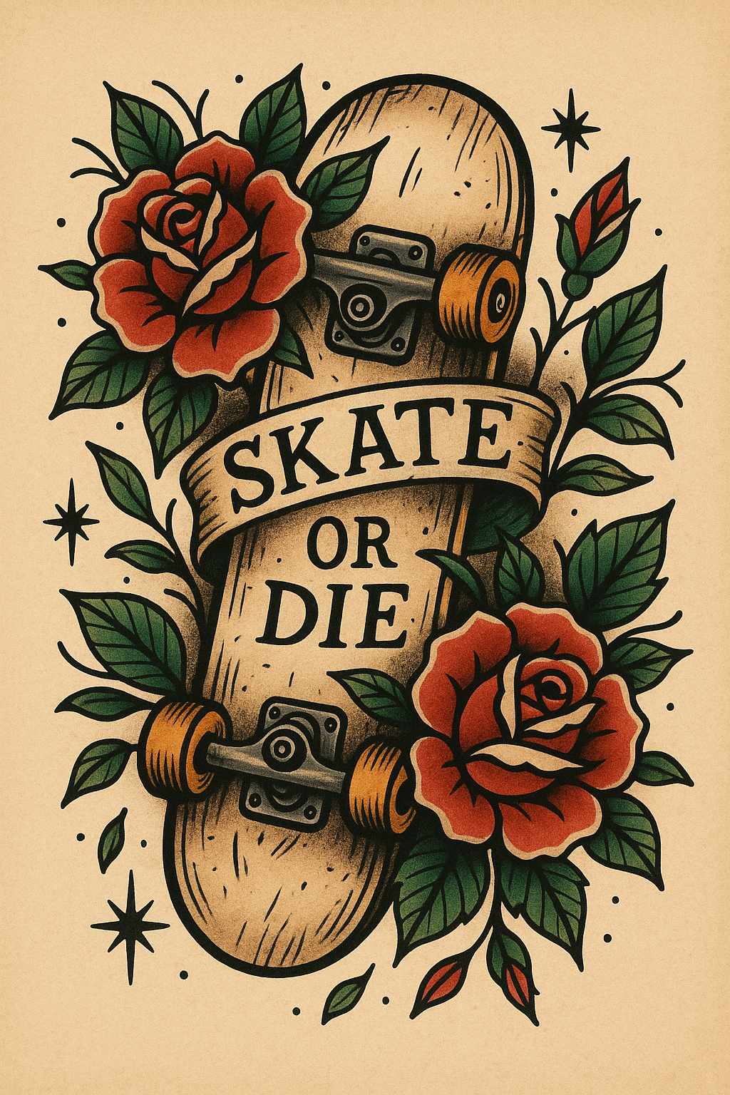 A vibrant illustration featuring a skateboard surrounded by roses and foliage, ideal for tattoo art or skate culture graphics.