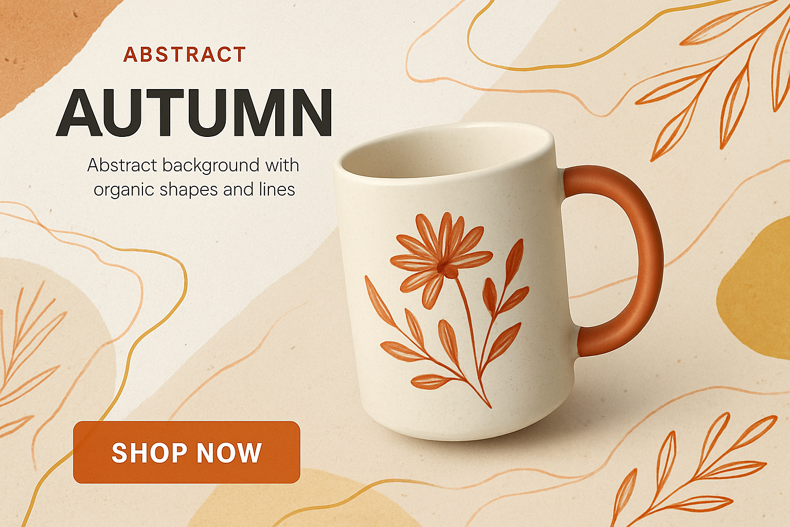This image features an abstract autumn-themed background with organic lines and floral designs. A ceramic mug with a floral pattern is displayed prominently, enhancing the seasonal aesthetic.