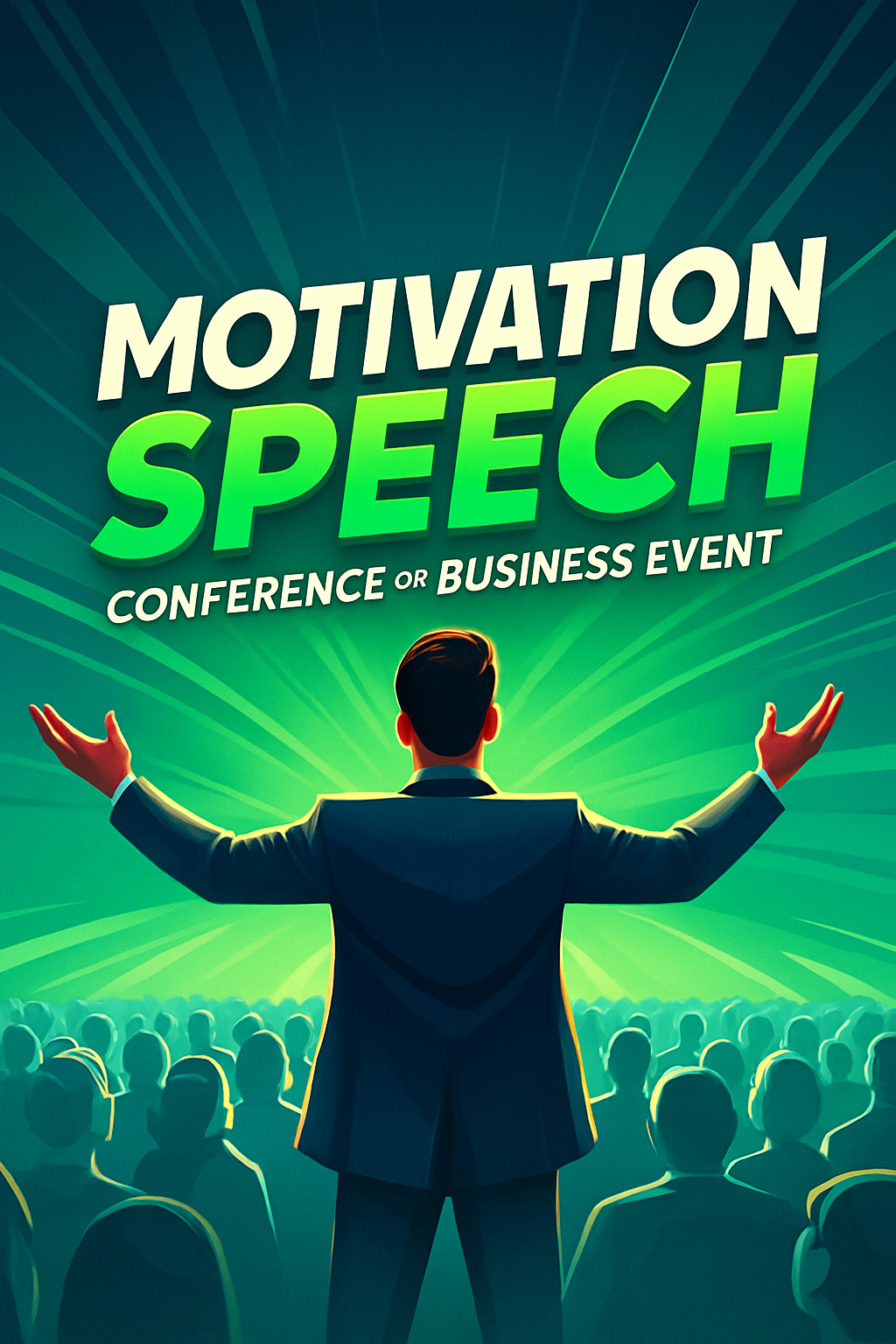 A dynamic back view of a motivational speaker at a conference, engaging the audience with expressive gestures. The setting features vibrant green rays emanating from the speaker, creating an energetic atmosphere.