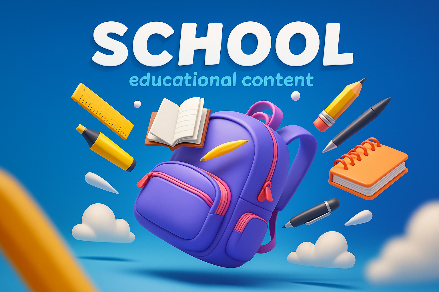 A vibrant 3D illustration showcasing a purple backpack surrounded by school supplies like pencils, notebooks, and books against a smooth gradient background.