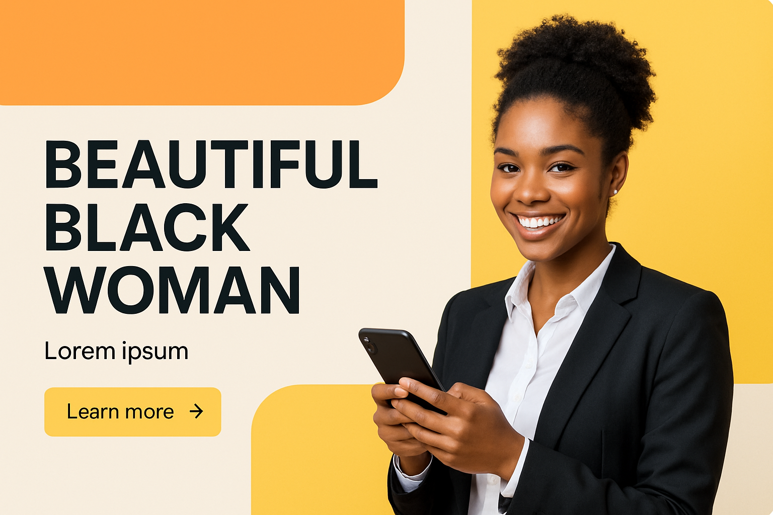 /Collection: /by davooda/Type: PNG/This image features a young black woman in a professional outfit, holding a phone. She stands against a bright geometric background, accentuated by bold typography and a call-to-action button.