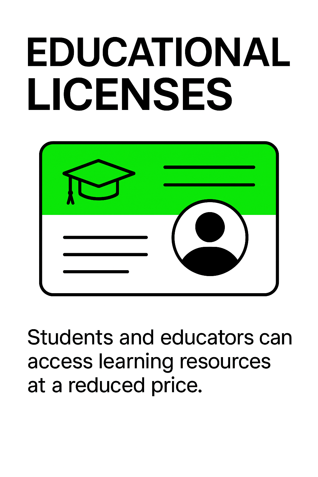 /Collection: /by davooda/Type: PNG/Informative promotional graphic highlighting educational licenses, featuring a simplified design with an academic cap icon, ideal for targeting students and educators.