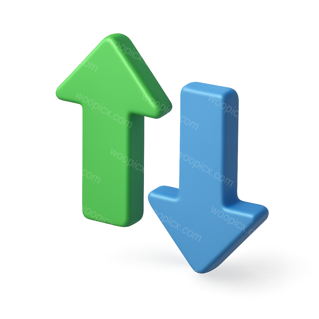 /Premium/Collection: /by davooda/Type: PNG/This image features two 3D arrows, one green pointing upward and one blue pointing downward. The arrows are presented in a three-quarter view with a glossy finish and a transparent background, giving a modern and volumetric appearance.