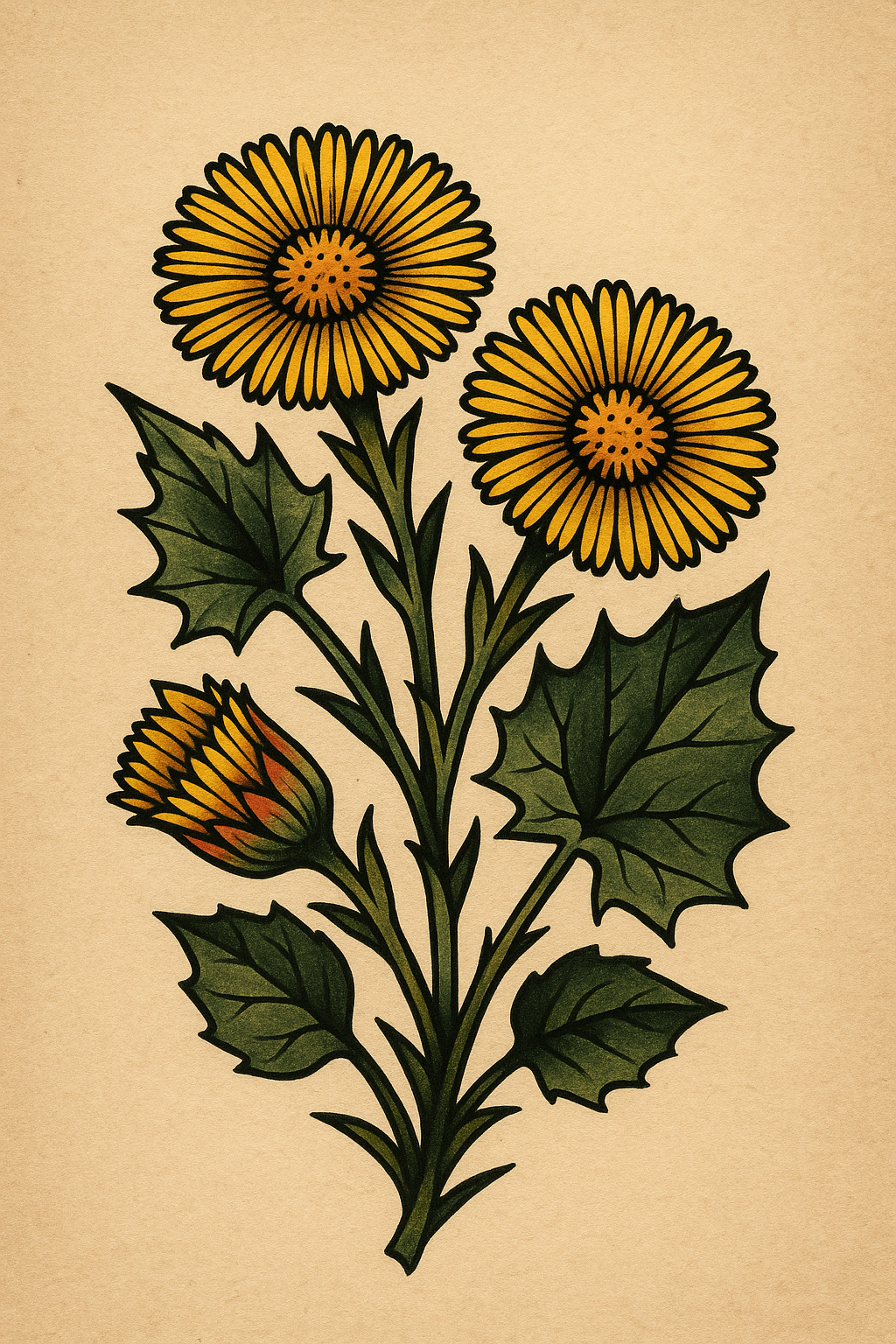 This image features a detailed vintage-style illustration of yellow flowers with green leaves, suitable for art prints or botanical studies.