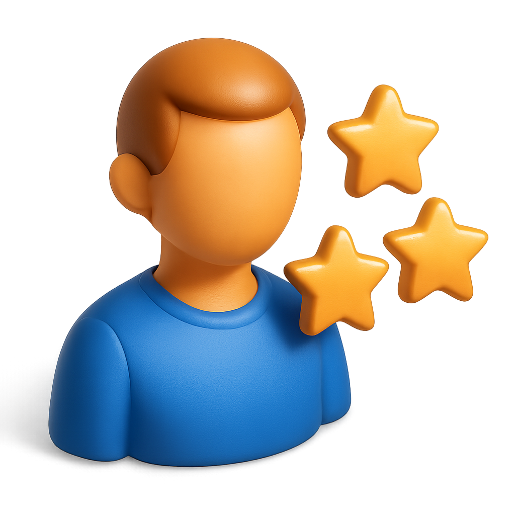 /Collection: /by davooda/Type: PNG/A stylized 3D representation of a person with three golden stars, captured in a three-quarter view. The icon features a vibrant blue shirt and a smooth, rounded design, set against a soft gradient background.
